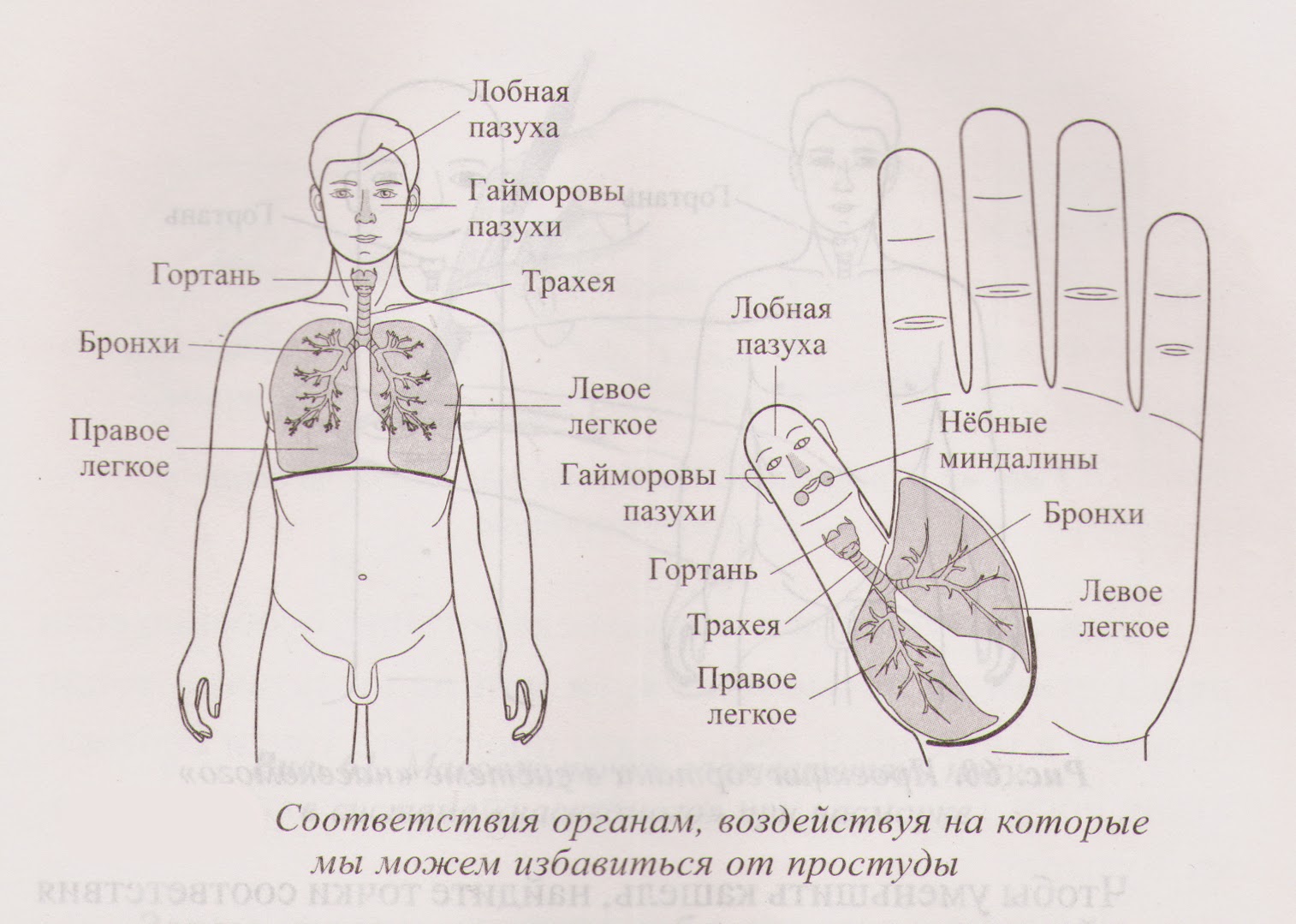 Для снятия одышки надо найти болезненные точки соответствия трахее, бронхам, лёгким, диафрагмы, сердцу. Лучше это сделать в стандартной системе соответствия кисти и стопы.